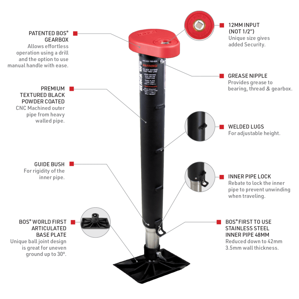 - Patented BOS® Gearbox features a unique 12mm drive set for added security and provides effortless operation with a cordless drill or manual handle as a backup.